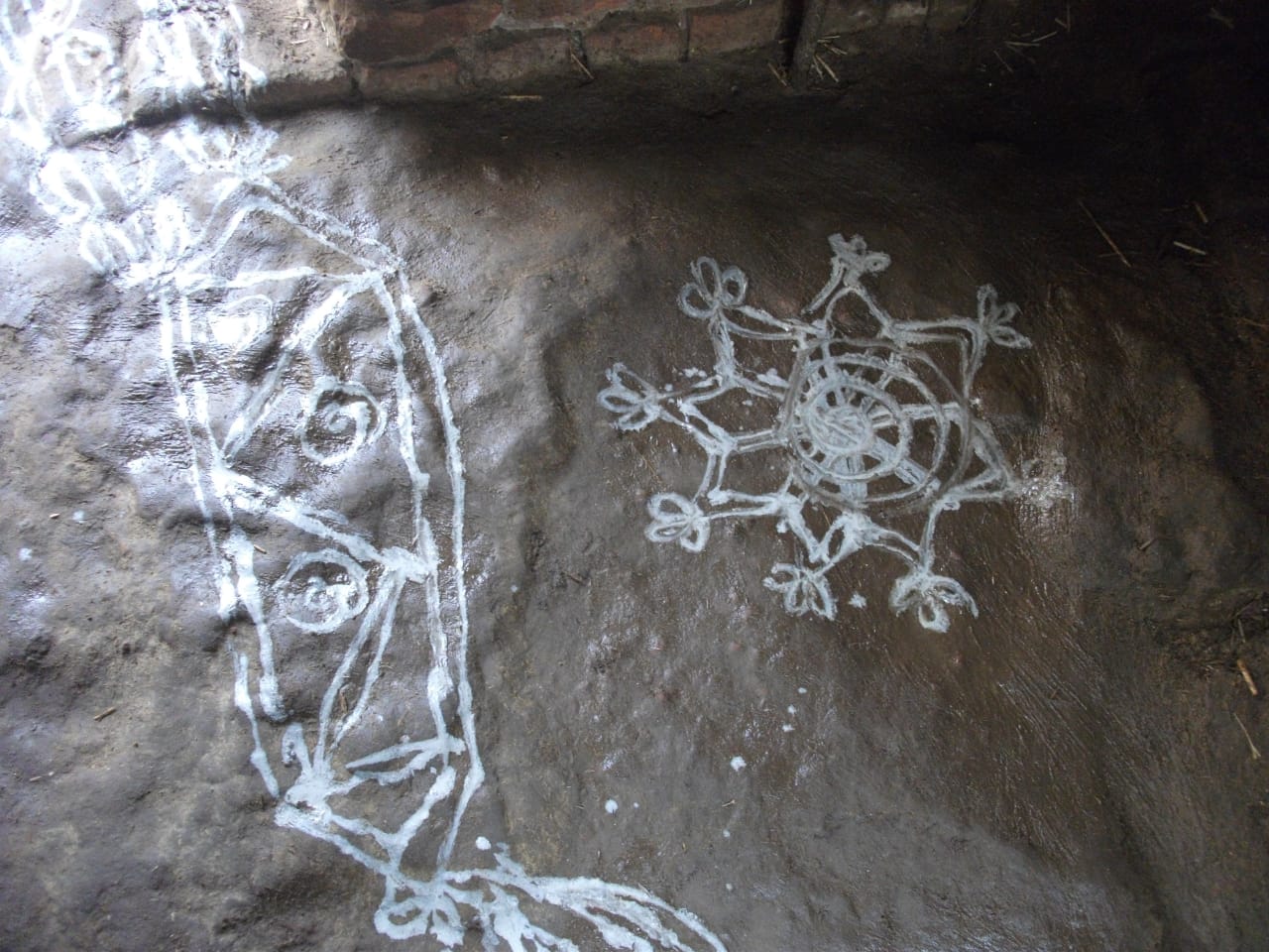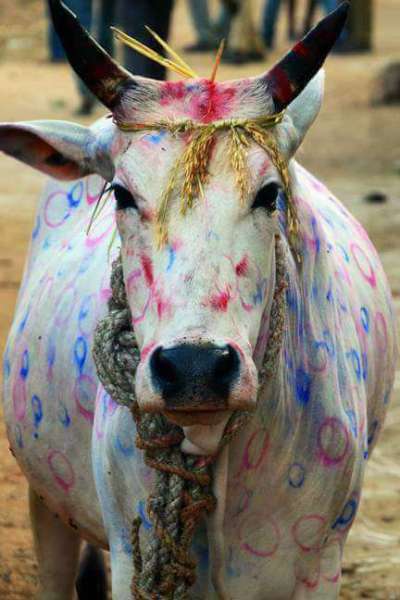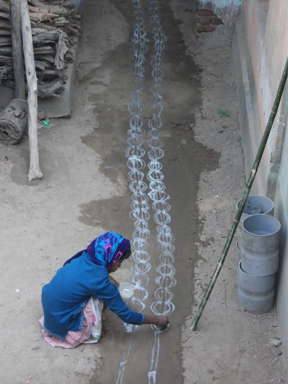 আলপনা দেওয়া চলছে। সোজা লম্বা হেঁটে এলে যেমন পর পর গোরুর পায়ের ছাপ পড়ে তেমনই। সেই আলপনা সদর দরজা পেরিয়ে চলেছে গোয়ালের দিকে। আজ সেখানে গরুদের বরণ হবে। এই সদর দরজা থেকে গোয়াল অব্দি তাদের পায়ের ছাপের আলপনা বড় প্রতীকী।